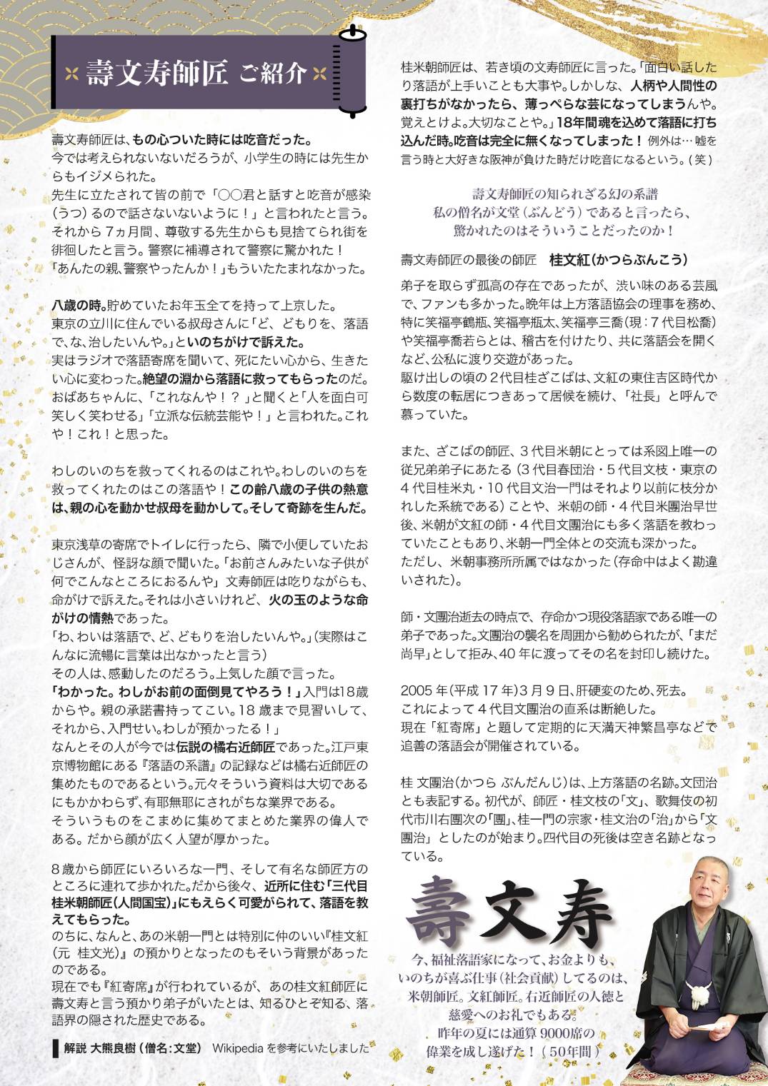壽文寿氏は子どもの頃に吃音症に悩まれていていたとのこと、学校ではどもりゆえにイジメられたそうです。絶望の最中のある日、ラジオで落語寄席を聞いて大感動、「人を面白可笑しく笑わせる」「立派な伝統芸能」である落語世界に明るさと情熱を見出され、それからずっと落語を通して話芸を磨き、人間性を深めることを人生の軸にしてこられました(ぜひ壽文寿師匠ご紹介のパンフレットをご覧ください!)。話しながら吃音を治す困難は想像するに余りありますが、18年打ち込んだ末に克服、今や落語人生50年を通して演じられたのは通算9,000席にも及ぶのだとか。そんな師匠のおもしろ深い落語を聞いてみたくありませんか!?